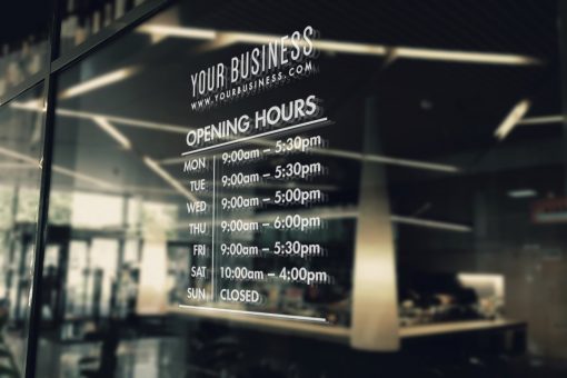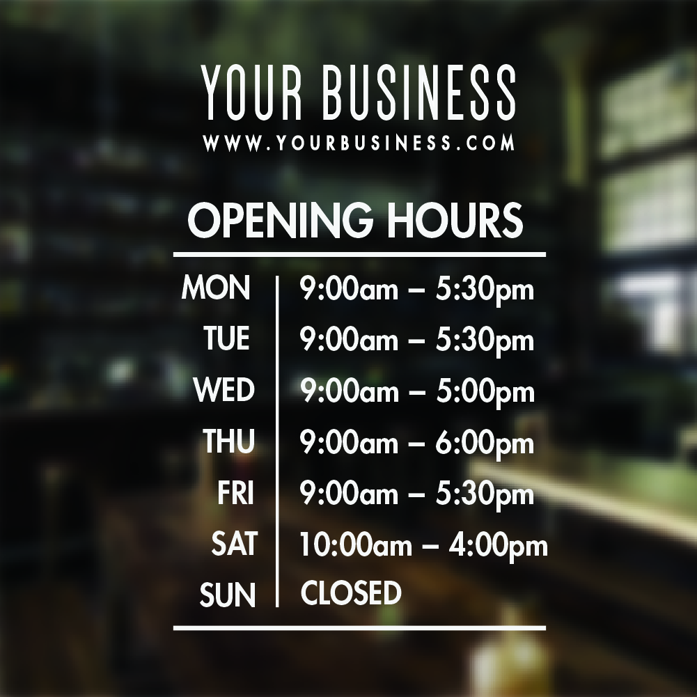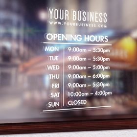 A professional looking Hours Of Business Open / Closed Shop Window Opening Hours Sign for your business. This stylish opening hours sign will stick firmly on your shop window or office door to display your opening times. This opening hours sign can be applied to windows, doors or any flat surface. Very popular with shop windows and doors, looks great on glass. Opening hours signs can be used by any type of business, shops, salons, dentists, offices, factories and more. Let your customers know when you are open.